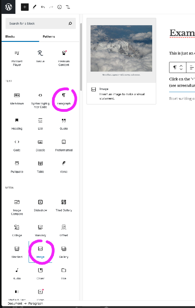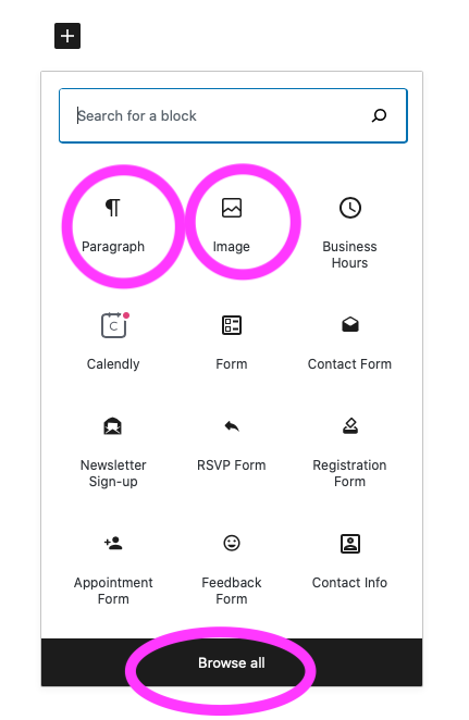 If you don’t see the buttons ‘Paragraph’ and ‘Image’ in this menu: click on ‘Browse all, the you will see them, along wit a lot of different features.