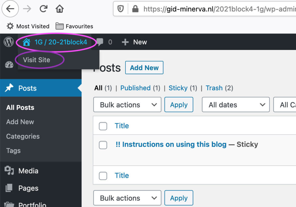 Or you als can visit the site directly from the wordpress (click home-icon on top left > click ‘visit site’, see screenshot)